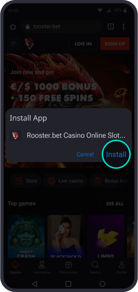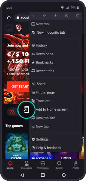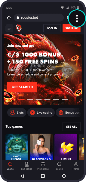 Gå til Rooster Bet-hjemmesiden og trykk på de tre prikkene for å åpne nettlesermenyen.