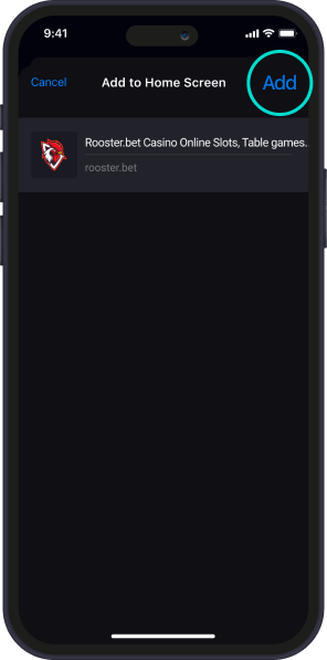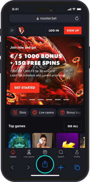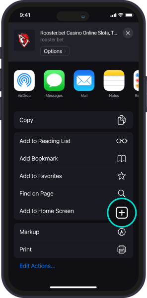 Åpne rooster.bet med Safari, trykk på «Del» i bunnmenyen.